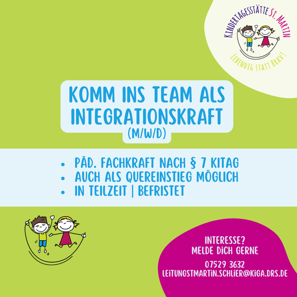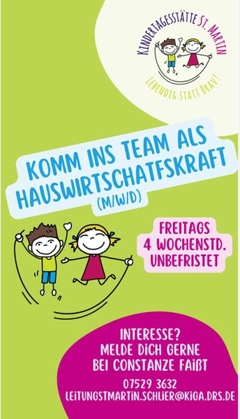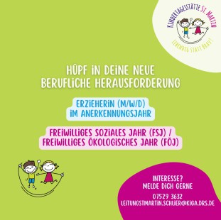 Kita-Leitung Frau Constanze Faißt unter 07529/3632 oder LeitungStMartin.Schlier@kiga.drs.de gerne zur Verfügung.